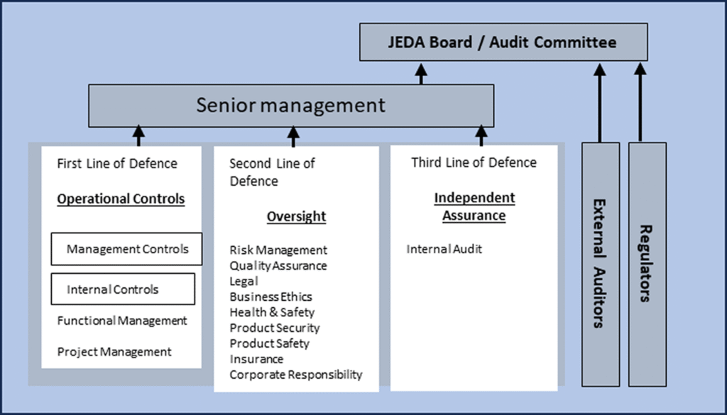 Regarding its Corporate Governance, JEDA has adopted the following Assurance Model, which is in line with internationally recognized best practices. It reflects that all activities within the company have multiple layers of scrutiny, each layer having its own focus.